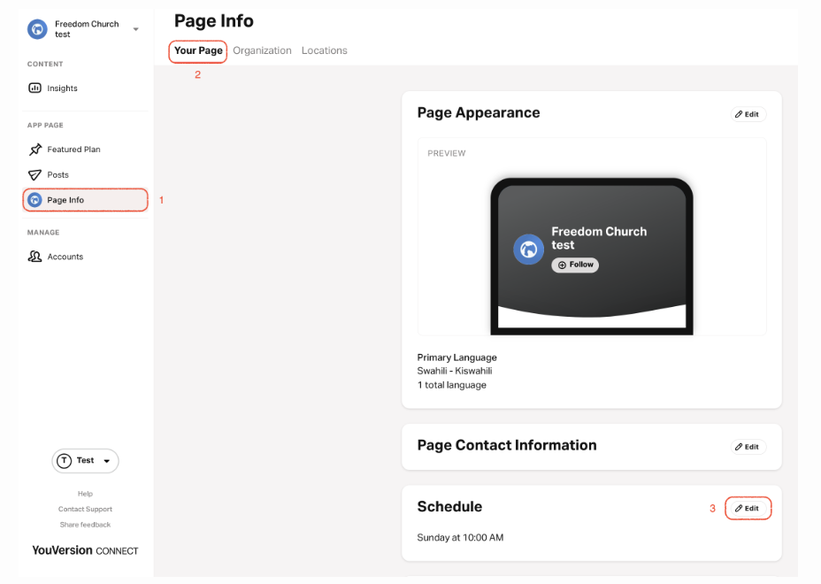 Service times will appear based on your selected "Start Week On" day. For example, if you say your week starts on Wednesday, then any services on Wednesday will appear at the top of the list.