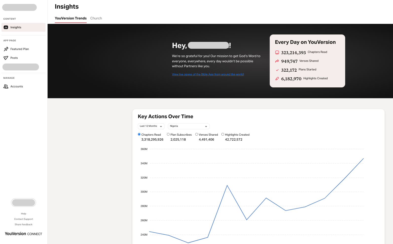 The YouVersion Trends dashboard provides valuable insights into how people engage with Bible App content. You can use these trends to understand engagement patterns, evaluate content performance, and make data-driven decisions about your future resources.