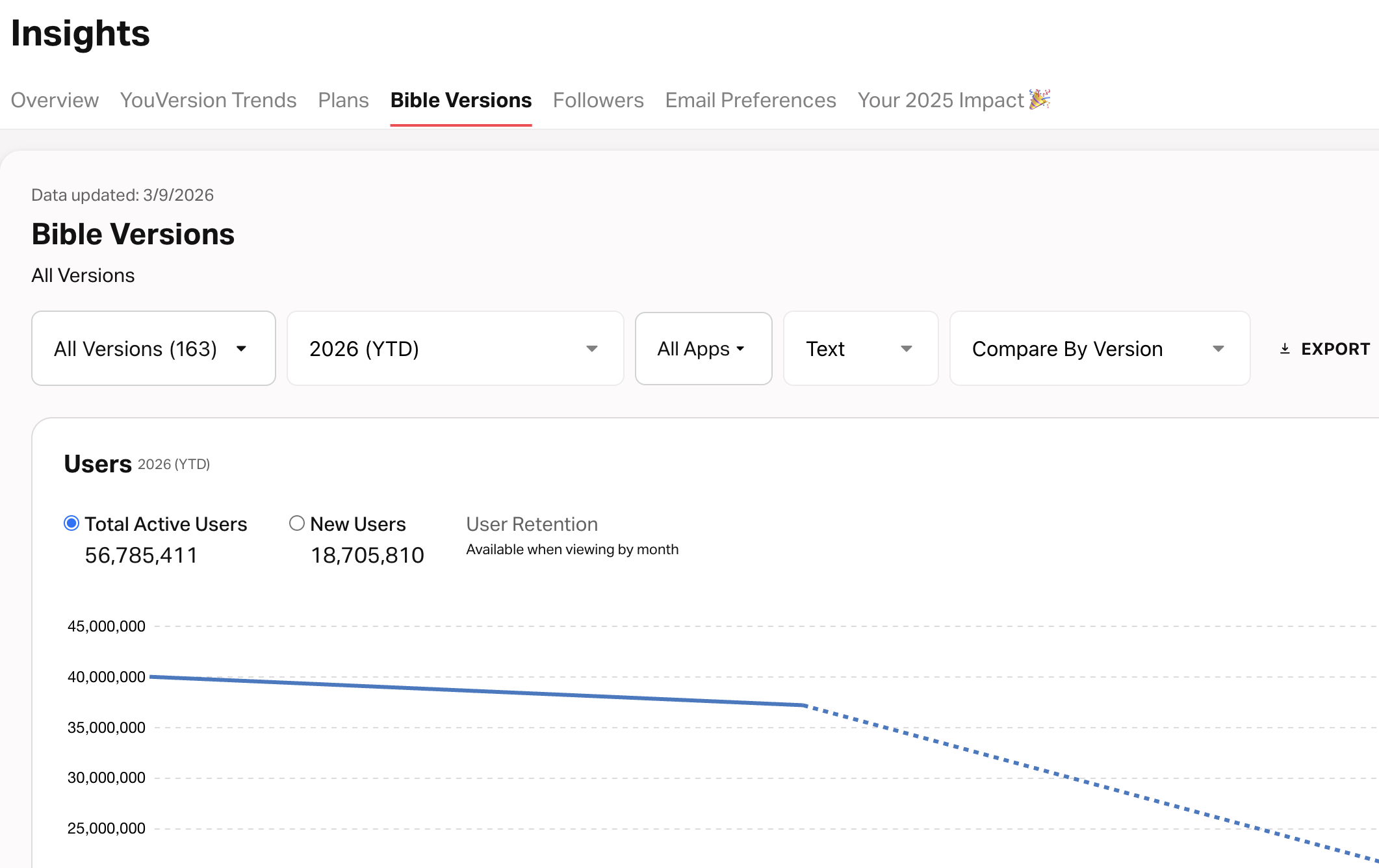 Through the Bible version dashboard, you will be able to view the data within your audio and text Bible versions. These Insights allow you to view aggregated data and see how the YouVersion Community is engaging with Scripture.