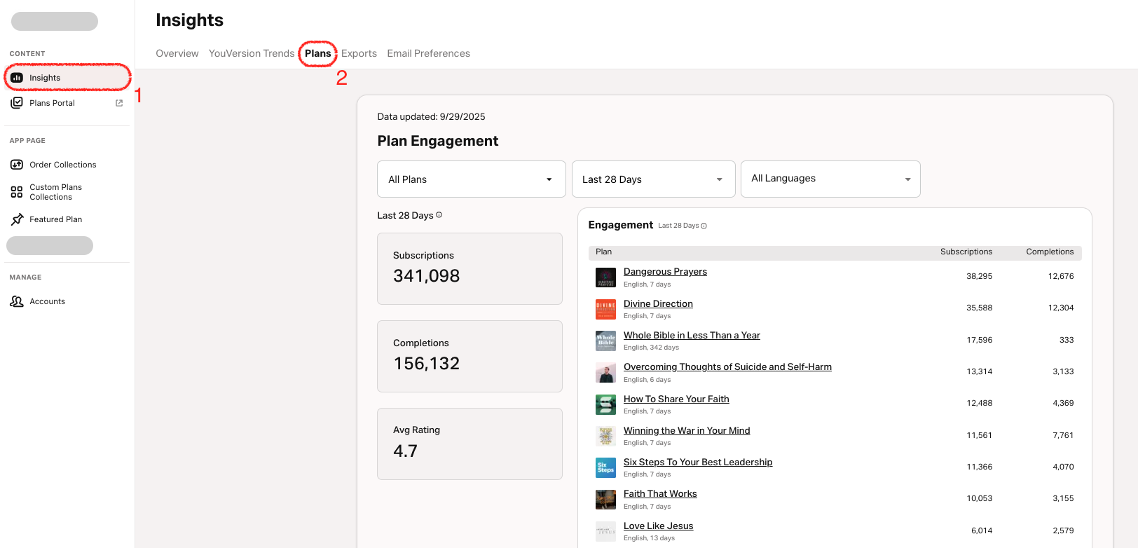 Plans Insights allows you to view aggregated data on how the YouVersion Community is engaging with your Plan(s) on the Bible App. This insight can be used to help you create relevant content for the community and know their needs.